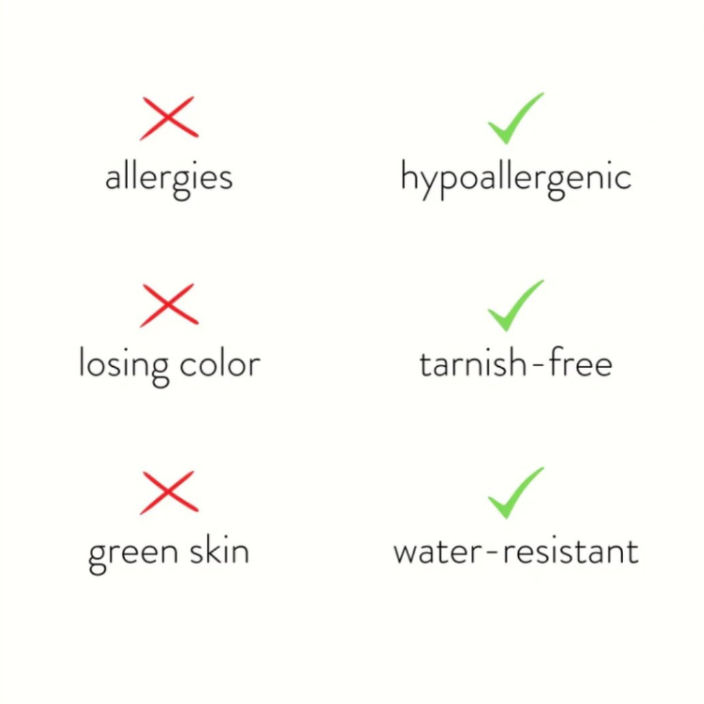 WATERPROOF, HYPOALLERGENIC, AND TARNISH RESISTANT.