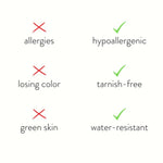 WATERPROOF, HYPOALLERGENIC, AND TARNISH RESISTANT.